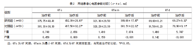 治疗后,研究组心电图参数优于对照组,差异均有统计学意义(P均<0.05)。见表2。