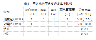 两组不良反应发生率比较,差异无统计学意义(P>0.05)。见表5。