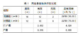 观察组总有效率高于对照组,差异有统计学意义(P<0.05)。见表1。