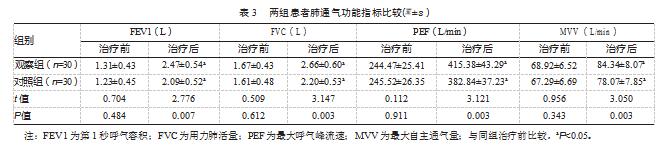 治疗后,观察组FEV1、FVC、PEF、MVV水平均高于对照组,差异均有统计学意义(P均<0.05)。见表3。