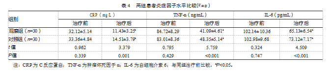 治疗后,观察组CRP、TNF-α、IL-6水平均低于对照组,差异均有统计学意义(P均<0.05)。见表4。