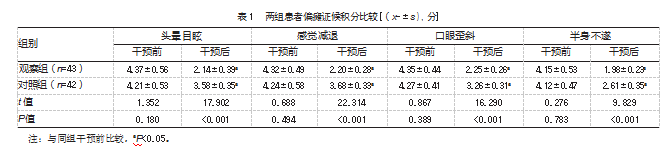 方便选择2023年1—12月徐州矿务集团总医院收治的85例中风后偏瘫患者为研究对象,按不同干预方案分为两组。对照组(n=42)中男22例、女20例;年龄58~75岁,平均(65.38±2.17)岁;病发时间14 d~11个月,平均(5.28±1.51)个月;梗死灶分布:右侧11例、左侧31例。观察组(n=43)中男25例、女18例;年龄55~73岁,平均(65.21±2.39)岁;病发时间10 d~12个月,平均(5.43±1.47)个月;梗死灶分布:右侧14例、左侧29例。两组患者一般资料比较,差异均无统计学意义(P均>0.05),具有可比性。本研究经徐州矿务集团总医院伦理委员会批准(【2025】011501),符合研究开展的伦理要求,患者家属均对本研究知情并授权。