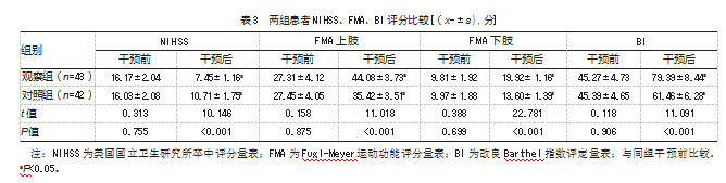 ③神经功能、肢体运动功能与生活能力。干预前后使用美国国立卫生研究所卒中评分量表(Na⁃tional Institutes of Health Stroke Scale,NIHSS)[8]评估神经功能,按照神经损伤程度从轻到重记0~42分,得分越低越好。干预前后使用Fugl-Meyer运动功能评分量表(Fugl-Meyer assessment Scale,FMA)[9]评估肢体运动功能,包含上肢(33条目)、下肢(17条目),所有条目均按照差到优记0~2分,得分越高越好。干预前后使用改良Barthel指数评定量表(Bar⁃thel Index,BI)[10]评估生活能力,共计10条目,单条目按照差到优记0~10分,总分越高越好。