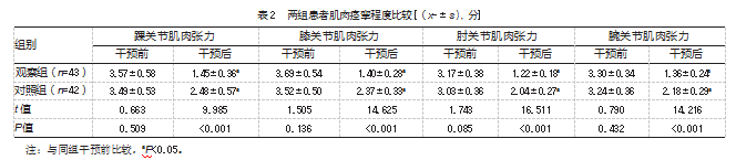 干预后,观察组各个关节肌肉张力改善效果优于对照组,差异均有统计学意义(P均<0.05)。见表2。