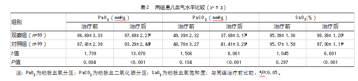①血气水平。于治疗前后,采患儿2 mL动脉血,使用全自动血气分析仪[沃芬医疗器械(嘉兴)有限公司,浙械注准20242222002,型号:GEM Pre⁃mier 5000],检测动脉血氧饱和度(arterial oxygen saturation,SaO2)、动脉血氧分压(arterial partial pres⁃sure of oxygen,PaO2)、动脉血二氧化碳分压(arterial partial pressure of carbon dioxide,PaCO2)。