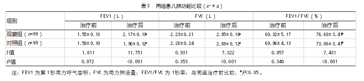 治疗后,观察组FEV1、FVC及FEV1/FVC水平优于对照组,差异均有统计学意义(P均<0.05)。见表3。