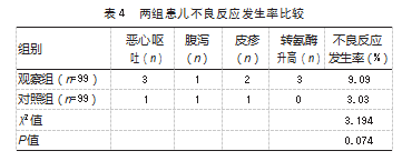 两组患儿不良反应发生率比较,差异无统计学意义(P>0.05)。见表4。