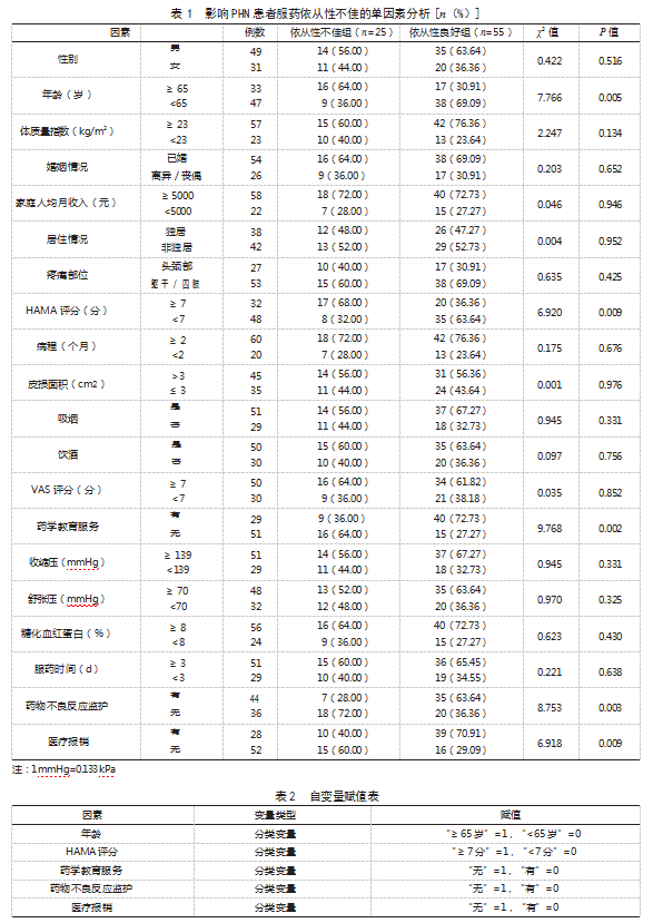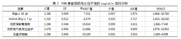 1.3观察指标(1)统计PHN患者服药依从性不佳的发生情况。(2)PHN患者服药依从性不佳的单因素分析。(3)PHN患者服药依从性不佳的Logistic回归分析。