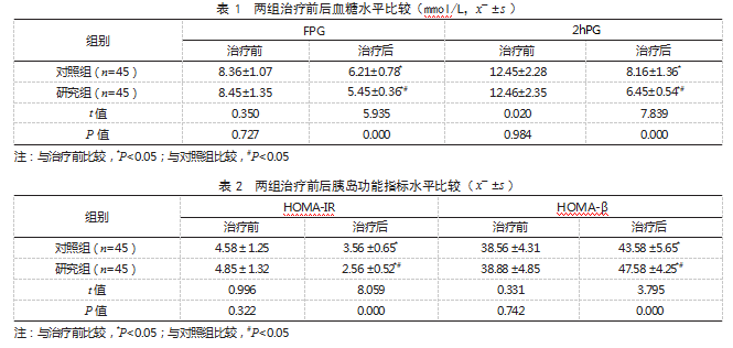 2.1两组治疗前后血糖水平比较治疗前,两组FPG、2hPG水平比较,差异均无统计学意义(P>0.05);治疗后,两组FPG、2hPG水平均低于治疗前,且研究组低于对照组,差异有统计学意义(P<0.05)。见表1。