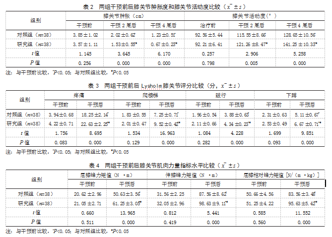 1.3观察指标(1)比较两组康复优良率。优:膝关节疼痛、肿胀等症状消失,Lysholm膝关节评分降低>80%;良:膝关节疼痛、肿胀等症状显著减轻,Lysholm膝关节评分降低60%~80%;差:膝关节疼痛、肿胀等症状无任何改变,Lysholm膝关节评分降低<60%。(2)比较两组干预前后膝关节肿胀度和膝关节活动度。干预前及治疗2、4周后,采用卷尺测量髌骨上极10 cm处的大腿周长;患者取坐位,用量角器定位股骨外踝,固定臂沿股骨长轴,移动臂贴合胫骨,随膝关节最大屈曲,记录夹角。(3)比较两组干预前后Lysholm膝关节评分,包括疼痛(0~25分)、爬楼梯(0~10分)、跛行(0~5分)、下蹲(0~5分),评分越高膝关节功能越好。(4)比较两组干预前后膝关节肌肉力量指标水平。采用多关节等速肌力测试检测屈膝峰力矩值、伸膝峰力矩值、屈膝相对峰力矩值。