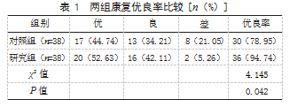 2.1两组康复优良率比较研究组康复优良率为94.74%(36/38),高于对照组的78.95%(30/38),差异有统计学意义(P<0.05)。见表1。