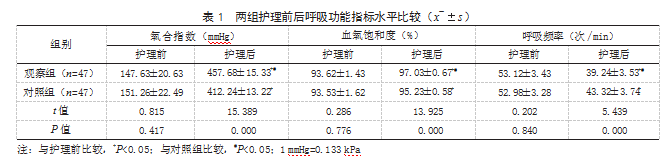 2.1两组护理前后呼吸功能指标水平比较护理前,两组氧合指数、血氧饱和度、呼吸频率等呼吸功能指标水平比较,差异均无统计学意义(P>0.05);护理后,两组氧合指数、血氧饱和度高于护理前,且观察组高于对照组,两组呼吸频率低于护理前,且观察组低于对照组,差异均有统计学意义(P<0.05)。见表1。