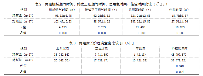 1.1一般资料回顾性分析2022年6月至2023年2月本院收治的94例新生儿呼吸窘迫综合征患儿的临床资料。纳入标准:符合新生儿呼吸窘迫综合征诊断标准[5];临床资料完整。排除标准:合并黄疸。患儿家长对本研究内容了解且自愿签署知情同意书。按不同护理方案将其分为观察组和对照组各47例。观察组:男22例,女25例;日龄2~27 d,平均(12.97±5.12)d;自然分娩29例,剖宫产18例。对照组:男24例,女23例;日龄1~26 d,平均(12.72±5.37)d;自然分娩31例,剖宫产16例。两组一般资料比较,差异无统计学意义(P>0.05),有可比性。