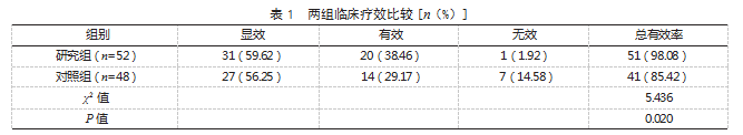 2.1两组临床疗效比较研究组治疗总有效率为98.08%(51/52),高于对照组的85.42%(41/48),差异有统计学意义(P<0.05)。见表1。