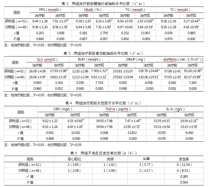 1.3观察指标(1)比较两组临床疗效。显效:患者蛋白尿、水肿等症状显著好转,估算肾小球滤过率(eGFR)提高≥80%;有效:患者临床症状好转,eGFR提高30%~79%;无效:患者临床症状轻微好转,eGFR提高<30%。总有效率=(显效+有效)例数/总例数×100%。(2)比较两组治疗前后糖脂代谢指标水平。使用便携式血糖仪测定空腹血糖(FPG)水平;采集患者空腹静脉血3 mL,3000 r/min,离心10 min,离心半径为10 cm,取上层血清冷藏保存待测。取血清,采用比浊法检测糖化血红蛋白(HbA1c)水平;采用酶比色法检测三酰甘油(TG)、总胆固醇(TC)水平。(3)比较两组治疗前后肾功能指标水平。取血清,采用酶联免疫吸附法测定血肌酐(Scr)和尿素氮(BUN)水平;收集患者24 h尿液标本,采用全自动生化分析仪检测24 h尿蛋白定量(24hUP)水平,并计算eGFR。(4)比较两组治疗前后炎性因子水平。取血清,采用酶联免疫吸附法测定C反应蛋白(CRP)、肿瘤坏死因子-α(TNF-α)、白细胞介素-6(IL-6)水平。(5)比较两组不良反应发生率。