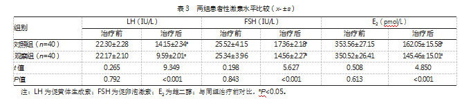 治疗后,两组各性激素水平都低于治疗前,但观察组低于对照组,差异均有统计学意义(P均<0.05)。见表3。