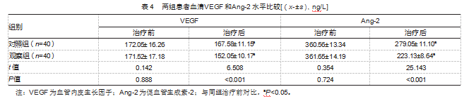 治疗后,两组VEGF和Ang-2水平都低于治疗前,但观察组低于对照组,差异均有统计学意义(P均<0.05)。见表4。