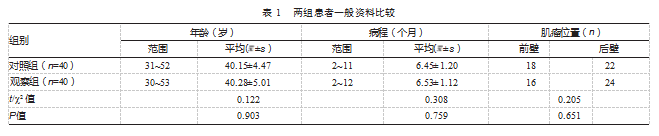 回顾性选取2024年6—12月仁怀市中医院收治的80例子宫肌瘤患者的临床资料,按照治疗方式不同分为对照组和观察组,各40例。两组患者一般资料对比,差异均无统计学意义(P均>0.05),具有可比性,见表1。本研究经仁怀市中医院伦理委员会审核批准(2024-伦理审查-20)。患者及家属均知情同意本研究。