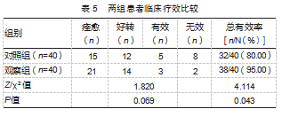 观察组总有效率高于对照组,差异有统计学意义(P<0.05)。见表5。