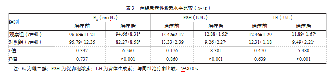 治疗后,观察组性激素(E2、FSH、LH)水平较对照组更优,差异均有统计学意义(P均<0.05)。见表3。