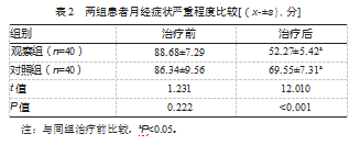 治疗后,观察组月经症状严重程度轻于对照组,差异有统计学意义(P<0.05)。见表2。