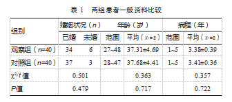 便利选取2024年1月—2025年2月于平凉市妇幼保健院就诊的80例子宫内膜异位症患者为研究对象。按不同治疗方法分组,每组40例。两组患者一般资料对比,差异均无统计学意义(P均>0.05),具有可比性。见表1。本研究经平凉市妇幼保健院伦理委员会审核批准(2023100376)。患者及家属对本研究均知情同意,且签署知情同意书。