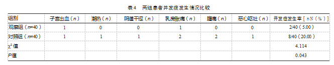 治疗后,观察组子宫出血、潮热、阴道干涩、乳房胀痛等并发症发生率低于对照组,差异有统计学意义(P<0.05)。见表4。