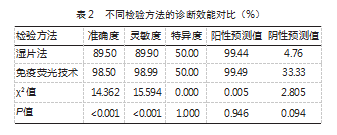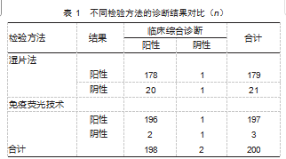 免疫荧光技术的准确度、灵敏度高于湿片法,差异均有统计学意义(P均<0.05)。见表2。