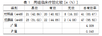 2.1两组临床疗效比较观察组治疗总有效率为95.92%,高于对照组的83.67%,差异有统计学意义(P<0.05)。见表1。