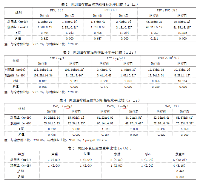 1.1一般资料回顾性分析2021年4月至2023年4月本院收治的98例AECOPD伴呼吸衰竭患者的临床资料。纳入标准:经临床症状评估、肺功能检查确诊,符合AECOPD的诊断标准[5],符合呼吸衰竭相关诊断标准[6];无血液系统、免疫性疾病;意识良好,能进行沟通。排除标准:合并心、肝、肾功能异常;无法沟通,意识不清;合并其他严重的肺部疾病;有药物禁忌证;合并恶性肿瘤。根据治疗方案不同将其分为对照组与观察组各49例。对照组:男26例,女23例;年龄48~80岁,平均(63.24±4.34)岁;AECOPD病程1~6 d,平均(3.21±0.74)d;体质量指数(BMI)18~25 kg/m2,平均(21.14±1.34)kg/m2。观察组:男27例,女22例;年龄47~80岁,平均(62.88±4.31)岁;AECOPD病程1~7 d,平均(3.91±0.84)d;BMI 18~24 kg/m2,平均(21.95±1.29)kg/m2。两组一般资料比较,差异无统计学意义(P>0.05),有可比性。