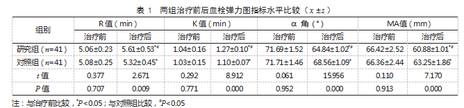 2.1两组治疗前后血栓弹力图指标水平比较治疗前,两组R值、K值、α角、MA值比较,差异均无统计学意义(P>0.05);治疗后,两组K、R值均大于治疗前,且研究组大于对照组,两组α角、MA值均小于治疗前,且研究组小于对照组,差异有统计学意义(P<0.05)。见表1。