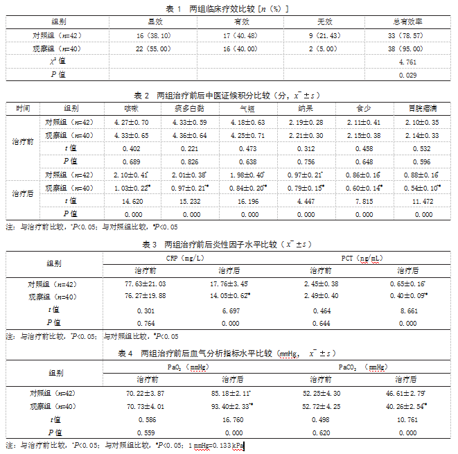 1.3观察指标(1)比较两组临床疗效。显效:咳嗽、咳痰、发热等症状均显著改善,中医证候积分降低≥70%;有效:上述症状均有所改善,30%≤中医证候积分降低<70%;无效:上述症状均无改善或加重,中医证候积分降低<30%。总有效率=(显效+有效)例数/总例数×100%。(2)比较两组治疗前后中医证候积分。治疗前、治疗10 d后,按照症状严重程度对咳嗽、痰多白黏、气短等主症和纳呆、食少、胃脘痞满等次症进行评估,主症每项计0~6分,次症每项计0~3分,评分越高表明症状越严重。(3)比较两组治疗前后炎性因子水平。治疗前、治疗10 d后,抽取患者空腹静脉血3 mL,离心后取血清,采用化学发光法检测降钙素原(PCT)水平,采用免疫透射比浊法检测C反应蛋白(CRP)水平。(4)比较两组治疗前后血气分析指标水平。治疗前、治疗10 d后,采用血气分析仪检测动脉血氧分压(PaO2)、动脉血二氧化碳分压(PaCO2)水平。(5)比较两组不良反应发生率。