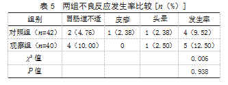 2.5两组不良反应发生率比较观察组不良反应发生率为12.50%(5/40),对照组不良反应发生率为9.52%(4/42),两组不良反应发生率比较,差异无统计学意义(P>0.05)。见表5。