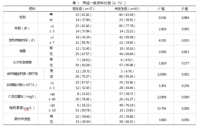 2.2两组一般资料比较发生组发热持续时间≥7 d、合并胸腔积液/肺不张、C反应蛋白≥40 mg/L、降钙素原≥10μg/L等占比均高于未发生组,差异有统计学意义(P<0.05);两组性别、年龄、喘息情况、大片状致密影情况、白细胞计数、肺外并发症等比较,差异均无统计学意义(P>0.05)。见表1。