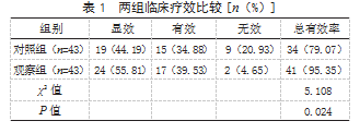 2.1两组临床疗效比较观察组治疗总有效率为95.35%(41/43),高于对照组的79.07%(34/43),差异有统计学意义(P<0.05)。见表1。