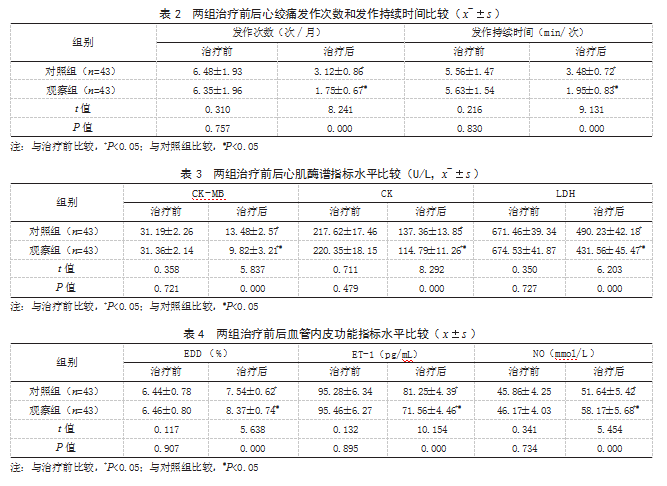 1.1一般资料选取2021年6月至2024年6月本院收治的86例冠心病PCI术后心绞痛患者进行前瞻性研究。纳入标准:符合《稳定性冠心病基层诊疗指南(2020年)》中冠心病的诊断标准[5];经超声心动图检查确诊;符合PCI指征并接受治疗;术后发生心绞痛;临床资料完整。排除标准:合并凝血系统障碍;合并精神类疾病;合并免疫功能障碍;严重肝、肾功能衰竭;对本研究所用药物过敏。患者及家属对本研究内容了解并自愿签署知情同意书,且研究经本院伦理委员会批准(批准文号:SHWUK20210415-04)。按照随机数字表法将其分为对照组和观察组各43例。对照组:男27例,女16例;年龄56~75岁,平均(65.35±6.31)岁;冠心病病程2~12年,平均(7.74±2.36)年。观察组:男26例,女17例;年龄54~76岁,平均(64.82±6.58)岁;冠心病病程2~14年,平均(7.94±2.43)年。两组一般资料比较,差异无统计学意义(P>0.05),有可比性。