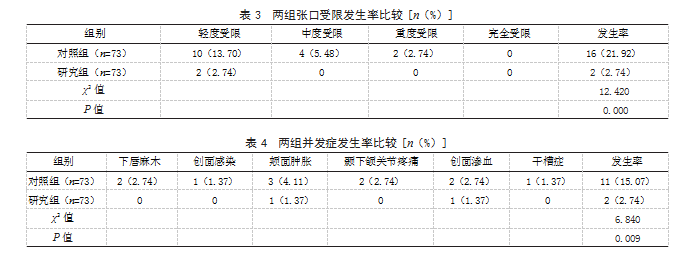 2.3两组张口受限发生率比较研究组张口受限发生率为2.74%(2/73),低于对照组的21.92%(16/73),差异有统计学意义(P<0.05)。见表3。