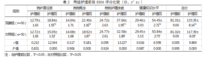 2.2两组护理前后ESCA评分比较护理前,两组ESCA各维度评分和总分比较,差异均无统计学意义(P>0.05);护理后,两组ESCA各维度评分和总分高于护理前,且观察组高于对照组,差异均有统计学意义(P<0.05)。见表2。