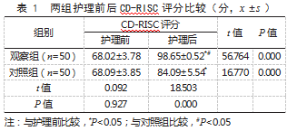 2.1两组护理前后CD-RISC评分比较护理前,两组CD-RISC评分比较,差异无统计学意义(P>0.05);护理后,两组CD-RISC评分高于护理前,且观察组高于对照组,差异均有统计学意义(P<0.05)。见表1。