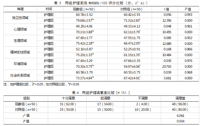 2.3两组护理前后WHOQOL-100评分比较护理前,两组WHOQOL-100各维度评分比较,差异均无统计学意义(P>0.05);护理后,两组WHOQOL-100各维度评分高于护理前,且观察组高于对照组,差异均有统计学意义(P<0.05)。见表3。