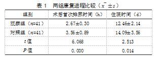 2.1两组康复进程比较观察组术后首次排尿时间、住院时间均短于对照组,差异有统计学意义(P<0.05)。见表1。