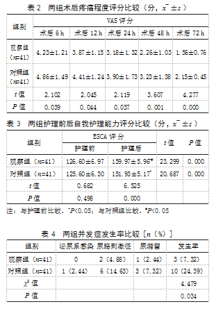 1.1一般资料选取2021年6月至2024年2月本院收治的82例肛瘘术后患者进行前瞻性研究。纳入标准:符合《肛瘘诊治中国专家共识(2020版)》中肛瘘相关诊断标准[4];经肛周超声、盆腔磁共振成像及瘘管造影等检查确诊;行保留括约肌挂线法手术;临床资料完整。排除标准:合并凝血功能障碍;依从性较差;合并血液疾病;合并神经或精神疾病;合并沟通障碍;合并严重心脑血管疾病;合并泌尿系统疾病。根据护理方案不同将其分为观察组与对照组各41例。观察组男25例,女16例;年龄24~58岁,平均(39.19±7.02)岁;病程0.5~12年,平均(6.43±2.91)年;瘘管类型:全马蹄形12例,半马蹄形29例。对照组男23例,女18例,年龄22~57岁,平均(38.73±6.65)岁;病程0.8~13年,平均(7.01±3.04)年;瘘管类型:全马蹄形13例,呈半马蹄形28例。两组一般资料比较,差异无统计学意义(P>0.05),有可比性。