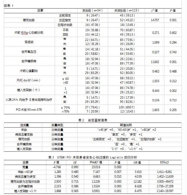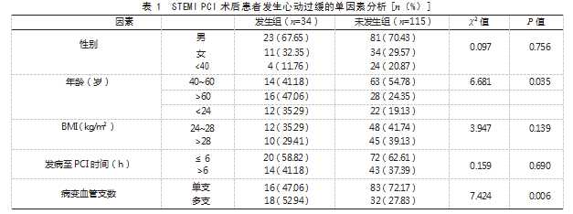 2.1 STEMI PCI术后患者心动过缓发生情况149例STEMI PCI术后患者中,发生心动过缓34例,发生率为22.82%(34/149);未发生心动过缓115例。