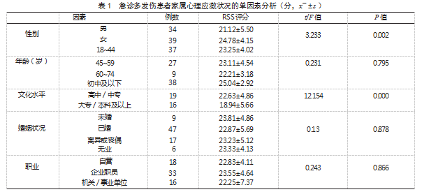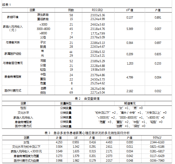 2.2急诊多发伤患者家属心理应激状况的单因素分析不同年龄、婚姻状况、职业、家庭环境、与患者关系、家属陪护经验、与患者居住情况等急诊多发伤患者家属RSS评分比较,差异均无统计学意义(P>0.05);女性、文化水平为初中及以下、家庭人均月收入<3000元、患者病情程度为危重、医疗付费方式为自费等急诊多发伤患者家属RSS评分较高,差异有统计学意义(P<0.05)。见表1。