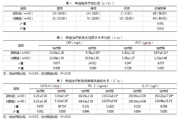 临床症状未改善甚至加重,胃镜下胃黏膜病变范围缩小<40%。总有效率=(显效+有效)例数/总例数×100%。(2)比较两组Hp根除率。治疗后1个月,采用14C-尿素呼气试验测定Hp根除情况。(3)比较两组治疗前后炎性因子水平。采集患者空腹静脉血5 mL,经3000 r/min,半径10 cm,离心15 min后,采用酶联免疫吸附法测定血清C反应蛋白(CRP)、降钙素原(PCT)水平。(4)比较两组治疗前后疾病相关指标水平。采用酶联免疫吸附法测定糖类抗原72-4(CA72-4)、胃蛋白酶原Ⅰ(PGⅠ)、胃泌素-17(G-17)水平。(5)比较两组不良反应发生率。