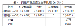 2.5两组不良反应发生率比较研究组不良反应发生率为14.00%,对照组不良反应发生率为6.00%,两组不良反应发生率比较,差异无统计学意义(P<0.05)。见表4。