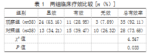 2.1两组临床疗效比较观察组治疗总有效率为92.11%(35/38),高于对照组的73.68%(28/38),差异有统计学意义(P<0.05)。见表1。