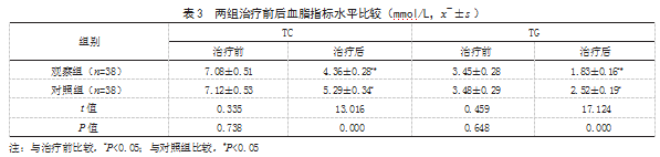 2.3两组治疗前后血脂指标水平比较治疗前,两组TC、TG水平比较,差异均无统计学意义(P>0.05);治疗后,两组TC、TG水平均低于治疗前,且观察组低于对照组,差异有统计学意义(P<0.05)。见表3。