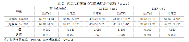 2.2两组治疗前后心功能指标水平比较治疗前,两组SV、LVEDD、LVEF水平比较,差异均无统计学意义(P>0.05);治疗后,两组SV、LVEF水平均高于治疗前,且观察组高于对照组,两组LVEDD水平均低于治疗前,且观察组低于对照组,差异有统计学意义(P<0.05)。见表2。
