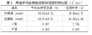 2.2两组平均血肿吸收率和住院时间比较观察组平均血肿吸收率高于对照组,住院时间短于对照组,差异均有统计学意义(P<0.05)。见表2。